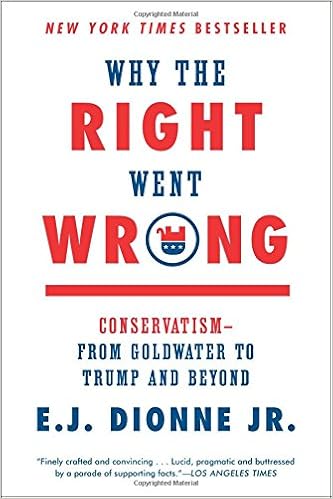 Disregarding the book’s title, which of course is meant to be provocative and to give the book a big splash, the premise of the book is straightforward. The right is being driven further right, but is repeatedly being failed by its politicians as they drive harder rhetoric while being unable to follow through. Disregarding rhetoric, and just looking at the book as a self-help diagnostic rather than a excoriation of the right, it provides some useful insight.Dionne’s book is a history of the right from Goldwater to the present that also parlays into the Clinton and Obama presidencies. The book’s premise is that the conservative movement has stagnated, through a cycle of broken promises since Goldwater. First, the politicians whip up fervor by promising to abolish big government or restore traditional values, but only to fail in those promises over and over again. The end result is a greater self identification of the conservative electorate, as those identifying as “very conservative” has nearly doubled from 1995 to 2015. The book addresses that this shift further right approaches an untenable problem, in that it is a coalition of three groups who serve different ideals: libertarians who want to shrink government, moralists who want “traditional” values and nationalists who want American global power. The punch line: you cannot have small government, big military, and you cannot reverse time on an evolving culture.The book if full of, if not too full of, historical examples of this pattern throughout recent history. If anything, the book is a bit too long and the over-use of examples are a bit tedious and lend to occasional skimming.