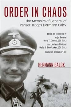 "Order In Chaos" by German Panzer General Herman Balck (May 2015).First quick note: there is no usual paper "book cover" or "dust jacket" to this book; essentially, the "book cover" has been printed onto the hard covers of this book -- a very fine high-quality book from the University Press of Kentucky (although the photos are murky, not sharp glossy).At the time of this review, no "Look Inside" feature was available to show its Table of Contents -- I'm sure that feature will soon appear. Until then:A much condensed "Table of Contents":WWI: chapters 1-6 (18%)Between the wars: chapters 7-10 (8%)WWII: chapters 11-19 (55%)notes, biblio, index, etc. (19%)As noted in this book's subtitle, this book contains the edited memoirs of German General of Panzer Troops Hermann Balck. At the end of WWII, as he did not participate in the "U.S. Army European Command" post-war interviews, Gen. Balck is not well known. However, he should be studied as German Maj.Gen. F.W. von Mellenthin (who served under Gen. Balck), wrote of him: "If Manstein was Germany's greatest strategist during World War II, I think Balck has strong claims to be regarded as our finest field commander" (p. ix). [Back in 1967, at my request, von Mellenthin kindly sent me an autographed photograph of himself.]For unexplained reasons, Balck wasn't interested in publishing his WWII experiences -- until after 1979 when he began participating in a number of history seminars. Fortunately, during his entire career, Balck maintained a journal -- which he edited and finally published in 1981: "Ordnung im Chaos" -- which became this book.This book's translators, MG D. Zabecki and LTC D. Biedekarken, provide an informative analysis both of Black's merits as a military commander and why he fought to the bitter end in supporting the German war effort -- I'm not going to summarize all of their thoughts here, just to mention that their "preface" ponders these concerns.What motivated Gen. Balck anyway? His son, Friedrich-Wilhel Balck, was killed in battle, as was his son-in-law: Hans Schlenther. Balck wasn't a member of the NAZI party. Pertaining to the attempted assassination of Hitler in July 1944, Gen. Balck wrote: "As far as I could tell at the time, there was hardly anybody in the responsible military leadership who would have sympathized with -- let alone supported -- those who attempted the assassination" (p. 358).Balck noted: "Jodl was right when he said that Hitler was our fate and that we would be victorious or go down with him. Hitler just was not replaceable" (p. 434).This book is Balck's autobiography, his memoir. I won't review his early youthful upbring here, nor his exploits during WWI. During WWII, he spent most of his service on the Eastern Front: the Russian campaign.[By the time that I was a young U.S. Army 2LT back in 1974, I had written to a number of German generals who had fought during WWII, and I asked them about their war experiences. I was interested in learning why they had fought until the end -- why hadn't they tried to end the war sooner? I received replies back from about 25 of them, including Manstein, Manteuffel, and others.] Balck apparently continued to soldier along to the bitter end as that was his profession: soldering.Jews: Gen. Balck wrote that while he had been informed that some Jews were being exterminated at Galicia and Auschwitz, he had also been informed that the Jews were being sent to resettlement areas. Balck wrote: "they illustrate how little we knew and how devilishly clever the cloak of deception had been. None of what was happening was supposed to filter through to the Wehrmacht (Army)" (p. 328) -- one is left wondering how ignorant Balck really was as to what was happening to the Jews.There is a German school of thought that they were the innocent victim of WWI, and Balck seems to support the view that Germany should not be held accountable for starting WWII either: "Personally, I am not certain that it really was not English politics that forced Hitler into the war" (p. 443).In the concluding chapter, "Looking Back", Balck evaluates the shortcomings of the Axis allies, the shortcomings of Hitler, and the "ignoramuses" Goring &Himmler (p. 449), and the superior coordination of the Allied countries. Balck also discusses the shortcomings as to how operational plans failed to properly address the correct supply of German units. Balck discusses many topics regarding political, economic, armament technology, & military themes that are too numerous and detailed to review here -- but well worth the read.I'll let other armchair generals muse whether or not Gen. Balck should have tacked left verses having tacked right at some river crossing.Balck finally concedes that "The solution to this problem [instigation of wars] is a free but firmly led democracy that makes human life worth living" (p. 453). Sadly he hadn't developed that belief before the outbreak of WWII, as he assigned the German military's steadfastness in following Hitler's orders until his demise as: "We had to fight until the [Allied} enemy conceded the impossibility of forcing us to our knees. That we were unsuccessful was not the fault of the soldier, who at all levels of rank from recruit to field marshal accomplished all that was humanly possible" (p. 454). Sadly, Balck seems to believe that the destruction of Germany at the end of WWII was the best "humanly possible" effort of the war-era German general command.[Not to provide any "cover" for Gen. Balck's opinions, but even highly trained American generals today still make "moral" versus "combat" mistakes: during early 2015 alone look at the number of American generals/admirals who have been relived of command for drunkenness, fund misappropriations, sloppy accountability of nukes or nuke training, failure to secure classified documents, etc.]Gen. Balck offers many opinions of many battles and personalities -- far too many for me to recount, review and critique here. Nonetheless, the ma