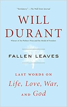 My parents didn't argue much when I was growing up, but I do seem to remember some contention on bookshelf space. Dad, a voracious reader, had shelves full of books. Mom, who loves a neat, aesthetically pleasing home, thinks bookshelves should look nice. So they jockeyed for space, with nick-knacks and decorative items competing with Dad's library for shelf space. On more than one occasion, I remember those conversations ending with Dad taking boxes of books to donate to the Corpus Christi Public Library.A large percentage of that portion of the shelf space reserved for books was taken up by a multi-volume set which I never read, but I always felt smarter just looking at those books. The set in question was Will and Ariel Durant's 11 volume The Story of Civilization. This popular and widely published (if not widely read) history, covering ancient times up to the Napoleonic Era, earned the Durants a Pulitzer and a Presidential Medal of Freedom.The Durants both died in the 1980s, but a Durant scholar uncovered a decades-old manuscript for a final book at which Will Durant had only hinted. Fallen Leaves: Last Words on Life, Love, God, and War contains the reflections of a very smart and very opinionated writer who knows he's on his last lap in life. Covering the stages of life, religion and morality, social issues, politics and war, art and education, the essays are at times rambling, often come across as a bit archaic, and are written, for the most part, in beautiful prose.Like I said, I never read The Story of Civilization or any of his other works, but based on what I know about Durant, I think he let his hair down with Fallen Leaves, writing a much more personal book. I had the feeling of sitting on the back porch with him while he, finally, told me what he really thought about these topics. But unlike your stereotypical cranky old man, Durant has a vast knowledge of history, philosophy, and culture, along with the broad perspective that knowledge brings.However, like cranky old men everywhere, he is set in his ways. He criticizes modern, abstract art ("empty vanity of an undisciplined mind"). He bemoans youthful ignorance (Life "gives us wisdom only when it has stolen youth."). He upholds traditional morality ("I still believe it advisable to discourage extramarital relations, just as it is useful to inculcate honesty, though we know that there will be many lies."). He has the amusingly endearing attitude of an old man who still enjoys the sight of a beautiful woman ("I think the architecture of woman is superb from whatever angle seen.")I was most interested in Durant's views on morality and religion. Raised a Catholic and, for a short time, a seminary student, Durant has a good working knowledge of Christianity. But early on, he was led astray by Darwinism and other influences. He still admires Christ and his ethics, and calls for "a great union of creeds and sects preaching the ethics of Christ." He makes a "persistent effort to behave like a Christian" but he "reluctantly abandoned belief in a personal and loving God."So he finally turned toward a sort of utopian fantasy. At this point I began to wonder about this historian's grasp of human nature and human society. As a Christian, I am inclined to believe that without a personal, loving God, the ethics of Christ are unsustainable. It seems to me that the twentieth century taught us the hazards of separating morality from God.Durant wasn't too concerned about religious views of eternal life and salvation. "I am quite content with mortality. I should be appalled at the thought of living forever, in whatever paradise." I don't know about his soul, but he achieved some measure of immortality through his books, as shown by the several feet of shelf space my mother somewhat reluctantly yielded for him.Thanks to Edelweiss and the publisher for the complimentary electronic review copy!