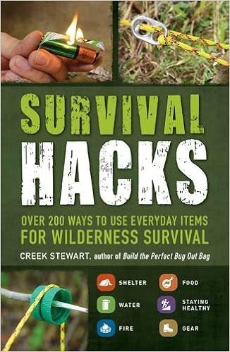 Review âSurvival Hacks: Over 200 Ways to use everyday items for Wilderness Survival Creek StewartâSurvival Hacksâ by Creek Stewart is one of the most useful, simple, real survival books I have seen. Every one of the 200 hacks is something you can use for alternate purposes to improve your chance of survival your quality of life when surviving. Creek divides his book into chapters 1) Shelter 2) Water 3) Fire 4) food 5) staying healthy, 6) gear 7) forward movement 8) every day carry. The book is one long series of simple, inexpensive, alternate means of successfully achieving success in each of these critical areas.For example: easy ways to make tinder. Bike tube slingshot. Bow from skis. Shipping envelopes for water proof stuff sacks. drinking straws filled with petroleum jelly cotton balls. The list goes on and on.This book is not for the beginner prepper as basic knowledge and basic gear are still necessary.For the preppers: Think into the future. How long will your best prepared bug out bag last and keep you going. These are ways to extend that time period, and enable you to take advantage of the debris of the post SHTF environment while developing a long, long term survival set up in the real SHTF world. These are ways to make your life more comfortable and easier with the stuff you will find out there in the post SHTF urban or wilderness environment.For the wilderness survivalist: These are tricks you can prepare at home and take with you to make your wilderness trek easier and more comfortable. These are things you can stuff into your âpossibles bagâ to save you when you get lost. Or, if you want to follow Tom Brown (last chapter of âThe Trackerâ) entering the woods truly and literally naked except for a knife, these tricks will help you understand what you need to do to survive a full year of 4 hard seasons alone.Great Book, Creek. Truly useful and practical.