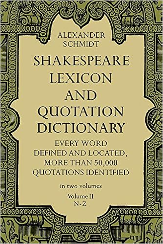This two-volume compendium of Shakespeare's vocabulary is a great addition to my shelf of works by and about him. When in need of an explanation of why he used a certain word, this dictionary not only gives the definition as Shakespeare understood it but also gives all the plays in which that word appears. A very useful excursion into the Elizabethan language. My only complaint is that one needs a magnifying glass to read it.