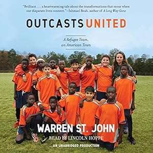 How does a soccer coach find a practice field for her team? Google Earth.But why, in a town that's not short of parks, is she looking for a field on Google Earth?Because the mayor keeps issuing what seem like illegal orders to deny her team access to any of the lush local fields.And why would he do that?Because this is Clarkston, Georgia, a town of 7,200 a dozen miles from Atlanta. And the members of the soccer team are not only boys of color, they are foreigners --- Africans, mostly --- who have come to Clarkston as part of a wave of immigrants.'Outcasts United: A Refugee Team, an American Town'is set in the feel-bad reality of a small town that never wanted to be the dumping ground for people fleeing conflict zones. It's a story of bumbling villains --- the mayor is a decent soul who's way over his head; the bad cop is the sort of jerk you can find anywhere --- and unlikely heroes. The first heroes are, of course, the Fugees, who overcome terrible memories, language barriers and unthinking prejudice to become --- against great odds --- a team. But at the top of the list is the team's coach: Luma Mufleh, who is, in her own way, also a refugee.The boys are really the lesser story, because without the commitment and self-sacrifice of this exceptional coach, their team would never have lasted a year. So weep for their pasts. Cheer for their success. Worry about their futures. But reserve the standing ovation for Luma Mufleh. Born into privilege in Jordan, she graduated from Smith College and decided to stay in the United States. Her father's response was to cut her off. "No more money, no more phone calls. He was finished with his daughter."So the Smith graduate got work cleaning toilets and washing dishes. She moved to Georgia for the weather. One day she drove to Clarkston and saw refugee kids playing a style of soccer she knew and liked. She went to the YMCA, discovered a coaching job was available, and was hired to run a girls' team. Just one accident after another.....Mufleh did not coddle her players. She expected discipline and compliance, and when she didn't get it, the kids paid they price. Her girls ran a lot --- but if they were late, they ran extra laps. And woe be to the player who complained to her parents.The boys were even more challenging, if only because they represented more of a threat to the town. They weren't. They were just poor, often hungry, not really ready to assimilate. Mufleh worked 60 hours a week coaching them, helping their families, making sure they got their school work done. Exhausting? "You start off on your own," she says, "and you suddenly have a family of a hundred and twenty."St. John draws the boys as well as he can, but their stories do merge. You think nothing that happens to them in Clarkston can be half as dramatic as the events that brought them to America --- imagine being a kid in Liberia and running out of your house as your father is being killed inside. Well, imagine, in America, seeing your coach arrested, handcuffed, and carted off to jail --- as you're going to a game! [Mufleh's crime? A burned-out tail light.]The soccer style of the Fugees is exciting, and St. John's descriptions of their games are crisp and tense. But their victories on the field are small compared to what their coach accomplished in practice and in her pre-game talks. Luma Mufleh deserved the front page Times story. She earned --- many times over --- the money that flows to the team from the sale of the film rights. And she's more than worthy of this 300-page Valentine.