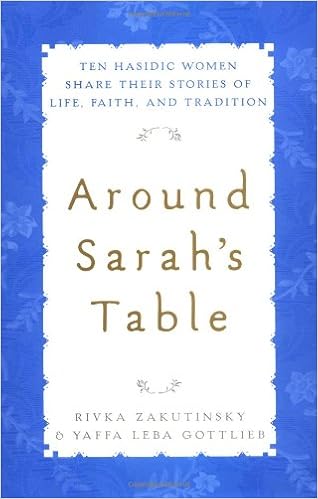 Around Sarah's Table (2001) is a set of 10 vignettes about Lubavitcher Hasidic women in modern American society. The ten women featured in this book are participants in a shiur (Torah class) held at lunchtime on Tuesdays in Sarah's home within Borough Park in Brooklyn. These women read a weekly parsha (portion), containing one or more quotations from the Torah and some commentary, and then discuss the lesson.Shaina is a convert to Hasidic Judaism from a Reformed family and has not had much contact with other Hasidic women. She and her husband have adopted two Down's Syndrome children and Shaina is running herself into the ground trying to do everything for her children. Shaina is a writer of children's stories and Reva, her publisher, strongly suggests that she spend some time away from her children, so Shaina arranges for a sitter so that she can attend the shiur.Reva started a small publishing house to provide stories suitable for instructing her own children in Hasidic values and has since expanded to an international operation. Her husband has always encouraged her efforts, but lately he has been much troubled by his diabetes. His condition is serious enough to require shots and other medical assistance and the burden of his care has fallen mainly on Reva. She is feeling overwhelmed by her responsibilities.Tamar is a mother and homemaker who is concerned about a husband for her daughter Abigail. Her older children have been successfully married to compatible mates, but Abigail has not yet met a man that suits her. Moreover, a suitable mate for her younger son Ephraim has been found, but it is not appropriate for a young man to be married before his older sister.Rachel is a resident of Williamsburg, the oldest Jewish community in Brooklyn.