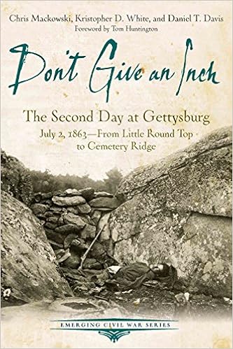 The fighting on July 2, 1863, on the Union left and center includes some of the climactic and most confusing action of the Battle of Gettysburg. In their new book, "Don't Give an Inch: The Second Day at Gettysburg July 2, 1863, From Little Round Top to Cemetery Ridge" authors Chris Mackowski, Kristopher White, and Daniel Davis offer an accessible and riveting introduction to this critical aspect of the battle. The book is part of a series in process which will cover the entire three days of Gettysburg. Additional related books in the "Emerging Civil War Series" of Savas Beatie cover the movements of the armies leading to and from Gettysburg ("The Last Road North" by Orrison and Welch) together with individual actions such as the cavalry battle at Brandy Station ("Out Flew the Sabres" by Wittenberg and Davis)."Don't Give an Inch" is organized as a driving tour of the battlefield. The book sets the stage by examining the status of the battle after the fighting on July 1 and the decisions the Confederate and Union high commands made in anticipation of the continuing contest. There are ten stops on the tour beginning with the new Seminary Ridge Museum and continuing through Pitizer's Woods, the Mississippi State Memorial and Warfield Ridge, Little Round Top and the 20th Maine position on East Little Round Top, Devil's Den, The Wheatfield, The Peach Orchard, the site of the wounding of Union general Dan Sickles, the 1st Minnesota Monument, and the High Water Mark, which roughly coincides with the High Water Mark of Pickett's Charge of July 3. The organization of the tour in itself gives a good overview of the course of the battle. The tour offers good clear driving and parking directions around the battlefield, including GPS coordinates.
