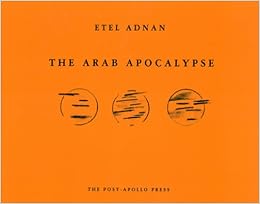 Elsewhere Etel Adnan has written already two decades ago: T.E. Lawrence was the total embodiment, and consumption by fire, of the English Colonialist actions in the Middle East of his time.By this all of the subsequent actions ("beacon-on-the hill etc.) taken by US representatives Reagan and 2 Bush's could be seen to have ignored the region's truths, so many of the objectives of the Iraq War not having been accomplished.Etel Adnan has spoken on Beirut. She makes Derrida's flight from Algeria to Paris look like an abandonment.Etel Adnan has spoken on Palestine and the Palestinian.Etel Adnan speaks in English in this book, despite its having been published in French originally. Etel's French version is not the searching language of the "French poets." Rather, her English shows more insight for this text, and the Post-Apollo edition is a magnificent demonstration of poetry and publishing for a pittance ($20). Who sells their copy of City Lights "Howl" by Ginsberg? no one. Adnan's "The Arab Apocalypse" is the same.Etel Adnan speaks on the Sun and the Arab (59 verses) in this Arab book,XV:"In the halls of the sun we manufactured virulent religionsWe burned still-born children HOU! HOU! the solar goddess!The brain is a sun STOP the sun is an eye!"Each nuclear explosion blooms into a sun-brain like a flower !…"Arabs are dancing in the dust DOUM ! the Tribe is deliriousthe yellow sun children's toy in the shanty-towns is eating the seaEach bullet is a ball planted in the brain YES !