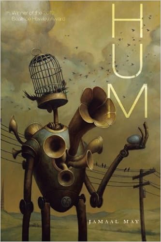 I admit to being drawn to this collection because of the gorgeous cover and its steampunk robot with a birdcage head, which immediately sparked my imagination. The physical book itself is also beautiful, with a lovely typeset. A smattering of dark pages, each for a "phobia" poem (such as "Athazagoraphobia: Fear of Being Ignored"), appear throughout the book, starting out black at first then lightening toward softer grays. It's an interesting way to highlight a set of associated poems and there's a subtle effect to reading words with white text on a dark page that suits the "phobia" poems. For example, reading "Athazagoraphobia: Fear of Being Ignored" on one of the rare black pages in the books creates an interesting contrast between text and the physical page.Hum is dedicated to "to the inner lives of Detroiters." When I think of Detroit these days, I picture photo essays that show the city in seemingly apocalyptic states of decay. May's poems reflect this state of everyday apocalypse. "Still Life" presents a "Boy with roof shingles / duct taped to shins and forearms / threading barbed wire through pant loops" as well as other trash can armor in the face of what seems to be a wasteland. While in "The Girl Who Builds Rockets from Bricks," a girl wanders in "the caverns of deserted houses," performing "her excavation for spare parts: // shards of whiskey bottle, matches, / anthills erupting from concrete // seams, the discarded husk / of a beetle."These poems thrum with rhythm, and sound plays a vital role, natural sounds mix with manufactured sounds mix with inner soul sounds. They are full of texture, bringing Detroit imagined and real into vibrant life."A humming bird drawsnectar in my thoughts, wings beating80-something times per secondbut there aren't many flowers here; it's been manysummers since I stopped even listening for bees."â from "A Detroit Hum Ending with Bones""Neat" is a disorderly pantoum, in which the repeated lines are almost but not quite repeated. there is enough variation that the new lines slip by almost unnoticed as repetitions. It describes a bar scene and a man sitting alone, drinking. "No one is above being invisible / not even me, with my shirt tidily pressed, // another man who's seen the bottom of a tumbler." The feeling is despondent and mundane. The pantoum form works perfectly here, the almost-repetition of lines reflecting the slipshod redundancy of everyday life and looping thoughts and questions that never seem to lead anywhere."You are a quarter ghost on your mother's side.Your heart is a flayed peach in a bone box."â from "How to Disapper Completely"In "Macrophobia: Fear of Waiting," he writes, "I was fascinated / that every time I tried to type love, / I missed the o and hit the i instead. / I live you is a mistake I make so often. / I wonder if it's not / what I've really been meaning to say." I make the same mistake quite often, and I have found myself thinking the same thing (I am only a little jealous that he put it into a poem first). There are so many passages, phrases, poems I love in this book that I find it hard to know which ones to focus on."Is the sun a flash grenade? This heatis so heavy the fruit stands buckle and ripplelike mirages, but your brother shivers"â from "Chionophpbia: Fear of Snow"This book is amazing (another I need to own) and is one of the best collections of poetry collections I've read this year.