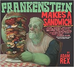 Okay. So here was my dilemma. I was supposed to review a children's book of poetry and I had several choices in front of me. I could review the inner city take on "Casey At the Bat". I could do the meaningful one about a Caribbean country. I could do the one about various epitaphs to people of different professions (I am not making this up). Or I could do the goofy monster one. And the ball fell in the goofy monster's court by a loooong shot. You hold "Frankenstein Makes a Sandwich" in your hands, and you may not be sure whether or not to trust it. Should I give this to a child? Will they actually enjoy it? Then you read the tiny byline under the title. "And other stories you're sure to like, because they're all about monsters, and some of them are also about food. You like food, don't you? Well, all right then". Any picture book of poetry that says, "Well, all right then", on its cover has won my irony-laden little heart. It's just a nice plus that the poems inside just happen to be funny, beautifully illustrated, and interesting in all sorts of different ways.Monsters. It's hard not to love `em. Especially classic movie monsters. Now what we have here are all the monsters you could think of put in a variety of humorous and peculiar situations. There's "Count Dracula: Doesn't Know He's Been Walking Around All Night With Spinach In His Teeth". Or howzabout, "The Mummy: Won't Go To His Eternal Rest Without a Story and Some Cookies"? They're all here, illustrated in a vast variety of ways by the ultra-talented Adam Rex. Each poem is a scintillating series of new ideas involving all sorts of critters. Hidden in the pictures as well are limericks from the fictional, "Michelle & VonFuzz Limerical Guide To Monsters". Kids will lap up the goofy pictures and creatures.