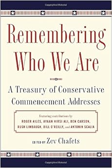 I would have said I’m not the intended audience for this book, but according to the introduction, I might be. Looking at the title, one might think Remembering Who We Are is a book for conservatives. It is, but editor Zev Chafets wants liberals and moderates to know and understand what this book has to say. He says he doesn’t agree with everyone in the book, and neither do I. And I’m certainly not conservative. However, I too believe it’s important to understand people with whom you disagree. I don’t love every essay in Remembering Who We Are, but it helped me understand more about what conservatives stand for, and for that, I’m glad I read it.This book comprises about 30 conservative speeches given at various colleges – some public and large, some private and tiny. At least one of the speeches was not actually given because of student or faculty outcry, and a few of them were published as general letters to college graduates rather than given at a specific college. They are very different – some congratulate the graduates; some tell them to shape up – but all contain some form of conservative ideals.There was a good deal in these addresses that I didn’t agree with. I sighed at Bobby Jindal’s insistence that the legalization of gay marriage would force churches to close their doors (no, that’s not how the law works), nor did I care for the way Ted Cruz and Ben Carson inserted invective against those darned liberals in their speeches. (I personally don't believe politics, right or left, has any place at a commencement ceremony, but that's an opinion most colleges don't seem to share.) And those are only a few points I contended within these pages.Even so, there’s a lot I agreed with in this collection.