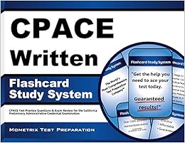 CPACE Written Flashcard Study System: CPACE Test Practice Questions & Exam Review for the California Preliminary Administrative Credential Examination (Cards) CPACE Written Secrets Study Guide: CPACE Test Review for the California Preliminary Administrative Credential Examination PSAT Exam Flashcard Study System: PSAT Practice Questions & Review for the National Merit Scholarship Qualifying Test (NMSQT) Preliminary SAT Test (Cards) Flashcard Study System for the NASM Personal Trainer Exam: NASM Test Practice Questions & Review for the National Academy of Sports Medicine Board of Certification Examination (Cards) Flashcard Study System for the NATA-BOC Exam: NATA-BOC Test Practice Questions & Review for the Board of Certification Candidate Examination (Cards) GRE Literature in English Test Flashcard Study System: GRE Subject Exam Practice Questions & Review for the Graduate Record Examination (Cards) NCE Flashcard Study System: NCE Test Practice Questions & Exam Review for the National Counselor Examination (Cards) CLEP Human Growth and Development Exam Flashcard Study System: CLEP Test Practice Questions & Review for the College Level Examination Program (Cards) Family Psychiatric & Mental Health Nurse Practitioner Exam Flashcard Study System: NP Test Practice Questions & Review for the Nurse Practitioner Exam (Cards) CPA Exam Flashcard Study System: CPA Test Practice Questions & Review for the Certified Public Accountant Exam (Cards) Masters Social Work Exam Flashcard Study System: ASWB Test Practice Questions & Review for the Association of Social Work Boards Exam (Cards) Phlebotomy Exam Flashcard Study System: Phlebotomy Test Practice Questions & Review for the Phlebotomy Exam (Cards) AFQT Flashcard Study System: AFQT Test Practice Questions & Exam Review for the Armed Forces Qualification Test (Cards) ACT Exam Flashcard Study System: ACT Test Practice Questions & Review for the ACT Test (Cards) MPRE Flashcard Study System: MPRE Test Practice Questions & Review for the Multistate Professional Responsibility Examination (Cards) FSOT Flashcard Study System: FSOT Exam Practice Questions & Review for the Foreign Service Officer Test (Cards) MAT Flashcard Study System: MAT Exam Practice Questions & Review for the Miller Analogies Test (Cards) PHR Exam Flashcard Study System: PHR Test Practice Questions & Review for the Professional in Human Resources Certification Exams (Cards) Praxis II Library Media Specialist (5311) Exam Flashcard Study System: Praxis II Test Practice Questions & Review for the Praxis II: Subject Assessments (Cards) GMAT Flashcard Study System: GMAT Exam Practice Questions & Review for the Graduate Management Admissions Test (Cards)